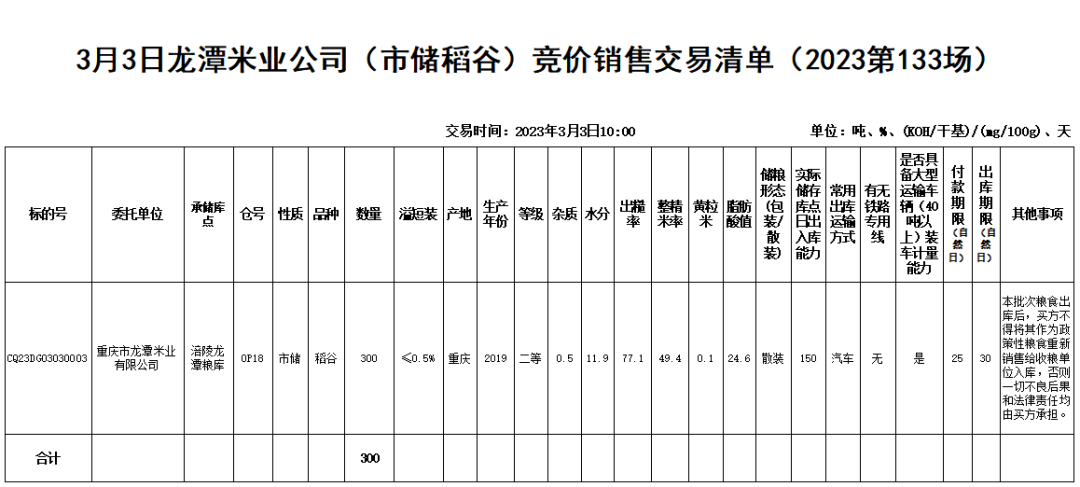 受重庆市龙潭米业有限公司委托,重庆市粮油批发市场有限责任公司(即国家粮食重庆交易中心,以下简称“批发市场”)定于2023年3月3日10:00举办龙潭米业公司(市储稻谷)竞价销售交易会,现将有关事项公告如下:2. 产地、年限及数量:重庆2019年产稻谷300吨。4. 标的质量:以交易清单质量指标为准。有意向参与交易的会员可通过“重庆粮网”(www.grainmarket.com.cn/centerweb/region/CQ)、“重庆粮食集团”官网(www.cqgrain.com)→资料下载→《竞价销售粮油看样单》路径,填写后加盖公章邮寄或扫描至批发市场,经批发市场审核盖章后,提前实地查看粮食实物质量和路况、出库条件等情况,确保所竞买的粮油符合自身使用用途,自主确定是否购买,并承担竞买后相应责任和市场风险。如未提前看样或看样后参与交易的,均视同认可标的质量,成交后不得再对质量提出异议。5. 本次交易清单附后。具体交易品种和数量等信息如有变化,以即时公告及交易清单为准。1. 报名资格:国内具有粮油生产、经营资格的企业或个人且在国家粮食交易平台注册的有效会员。2. 报名时间:2023年3月3日8:00前。报名参与交易即视作全面承认并遵守《重庆市地方政府储备竞价销售交易规则》和交易公告、交易清单等要求。1. 本次竞价交易使用国家粮食交易平台地储交易系统,2023年3月3日10:00通过网络对委托标的依次按交易节进行交易。请报名参加竞价交易的会员按时登录国家粮食交易中心官网(www.grainmarket.com.cn)→点击网页上方“请登录”或右方“用户中心”进行会员登录→点击“交易”板块→选择“重庆市场”→“ 3月3日重庆市地方储备粮(龙潭稻谷)竞价销售交易专场”。1. 保证金的收取和释放:参与竞价交易的买卖双方各须交纳保证金110元/吨(其中:履约保证金100元/吨和交易保证金10元/吨)。买方保证金须在竞价销售交易会开始前2个小时汇至批发市场指定银行账户;卖方保证金须在提交委托交易清单当日汇至批发市场指定银行账户。单笔合同交割完毕后,保证金释放。如合同部分交割,该合同数量的所有保证金处于冻结状态。2. 保证金转入:汇款时请备注“保证金”,待资金到账后,进入系统“用户中心”的资金界面,点击用户名称下方的“交易账户:明细”,将足额保证金“转入”重庆市场。3. 交易手续费:按成交金额的1.5‰向买方收取。1. 成交价格:为交易系统确认价格,即卖方承储库仓(罐)前散装车板交货价格,不含包装及整理费用,无出库费,无水、杂增扣量。如买方有包装以及整理要求,可与卖方协商,费用按照协商一致的标准另行结算。2. 合同签订:自成交之日起3个工作日内买卖双方在交易系统内签订电子购销合同或以邮寄、扫描等方式签订,如逾期未签订购销合同,则对违约方作违约处理。3. 付款及出库:买方自成交之日25天内付款完毕,30天内出库完毕。买方成交后将货款一次或分批汇入批发市场指定银行账户。出库前,买方在“我的合同”中点击“支付货款”来完成出库通知单申请。批发市场收到申请后,及时审核并开具《出库通知单》。4. 结算:出库完毕后买卖双方签订《验收确认单》,由卖方送达批发市场,批发市场在2个工作日内按《验收确认单》办理货款结算。2. 开户银行:中国农业银行股份有限公司重庆九龙坡中梁山支行 3. 账 号:31-0707010400088881. 本次交易规则详见“重庆粮网”(www.grainmarket.com.cn/centerweb/region/CQ)、“重庆粮食集团”官网(www.cqgrain.com)《重庆市地方政府储备竞价销售交易规则》,与此规则不一致的以本次公告为准。2. 会员在交易前到委托方存储库点看样或成交后到委托方存储库点提货时,需遵守当地的疫情防控政策,做好疫情防控工作。3. 本批次粮食出库后,买方不得将其作为政策性粮食重新销售给收粮单位入库,否则一切不良后果和法律责任均由买方承担。4. 各会员单位发现以陈顶新、转圈粮、套取财政补贴、人为设置障碍造成出库难、不执行出库质量检验制度等违法违规问题的,请拨打12325举报。5. 市场交易部联系电话:023-65269777 023-65269283▶ 网站 | www.grainmarket.com.cn/centerweb/region/CQ