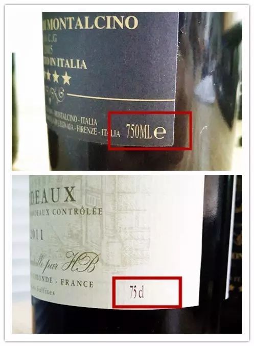 大多数的葡萄酒容量会显示75cl,但也有少部分为750ml(如下图所示)