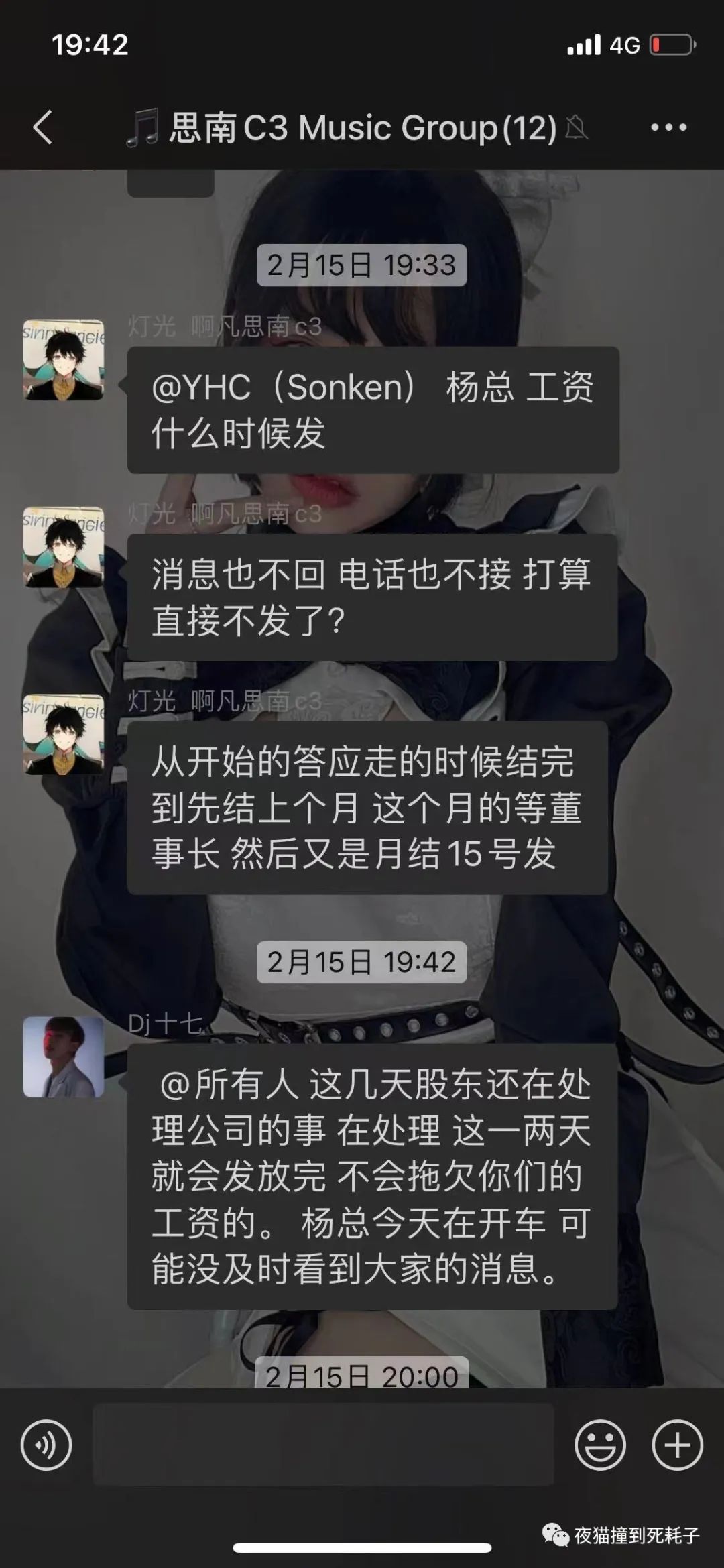 找黄总要 黄总也发放的工资 然后接手的店长杨总(真名杨洪超)然后舞台人员都全到场子后跟我们开会说现在我们的工资由总店
