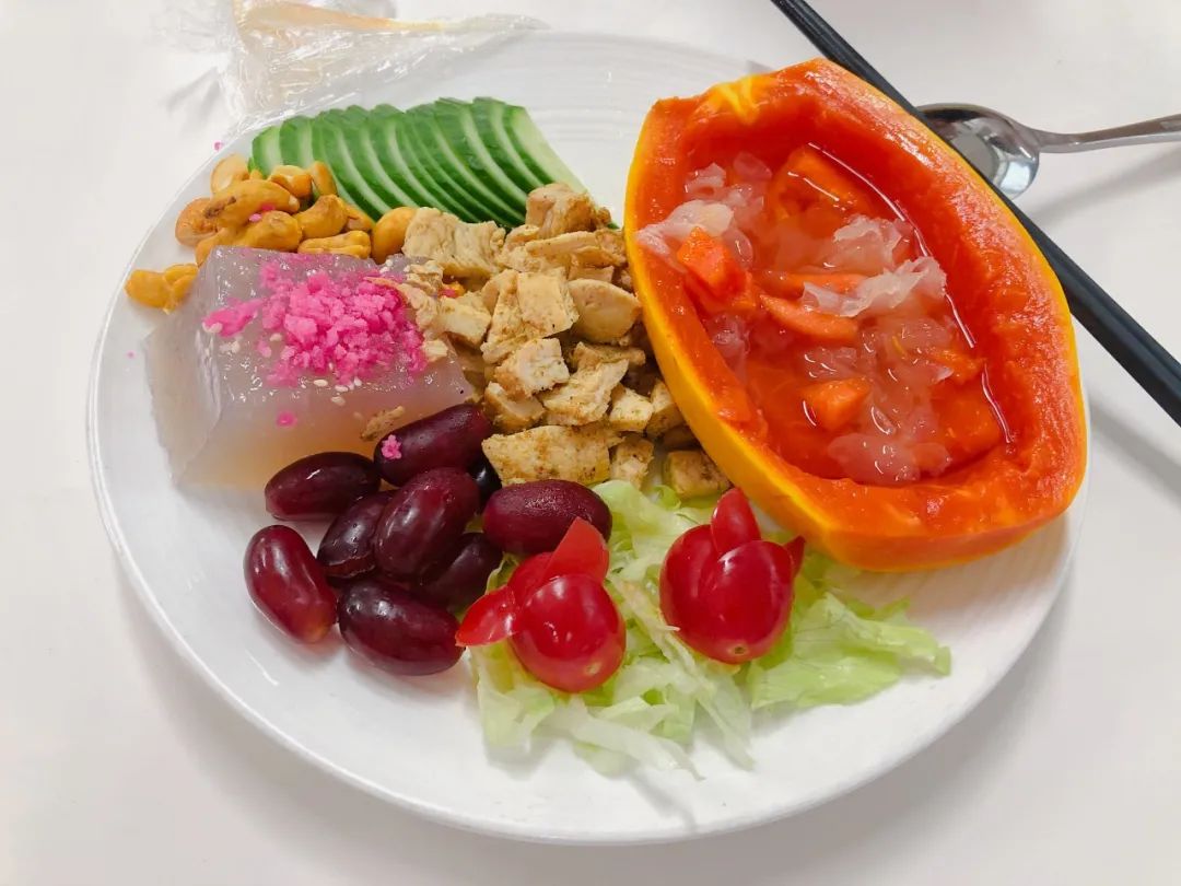 低脂鸡胸肉沙拉:热情的鸡胸肉碰上甜蜜的木瓜,一同走来的还有青瓜片、坚果、圣女果、无籽红提等,在味觉上丰富而多滋,在视觉上是高颜值享受。