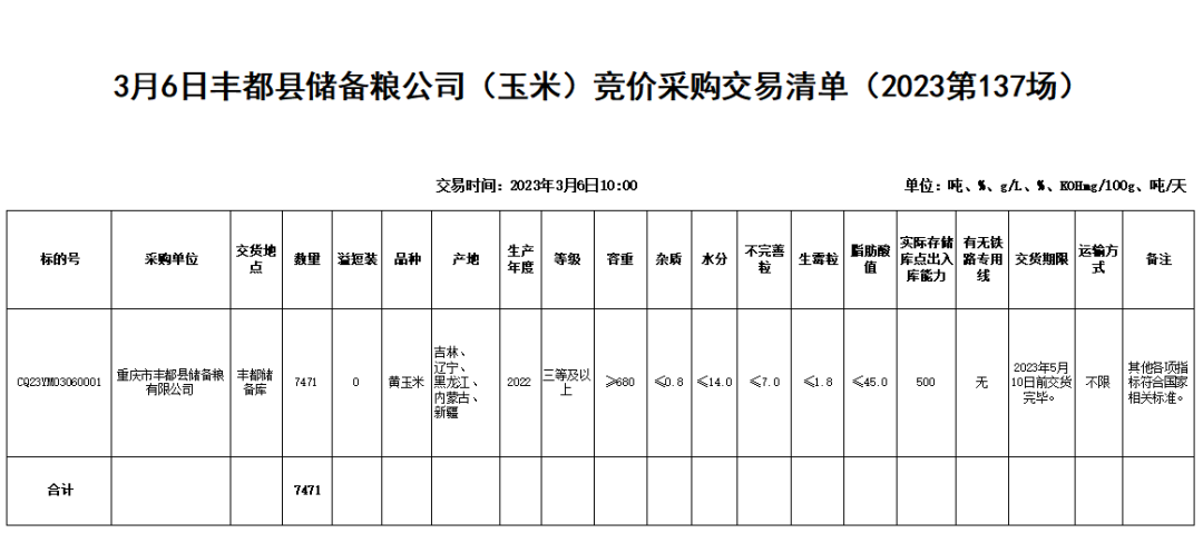 受重庆市丰都县储备粮有限公司委托,重庆市粮油批发市场有限责任公司(即国家粮食重庆交易中心,以下简称“批发市场”)定于2023年3月6日10:00举办丰都县储备粮公司(玉米)竞价采购交易会,现将有关事项公告如下:2. 产地、年限及数量:吉林、辽宁、黑龙江、内蒙古、新疆2022年产黄玉米7471吨。4. 交货地点:重庆市丰都县储备粮有限公司丰都储备库。5. 质量要求:一是符合玉米国标(GB1353-2018)三等及以上质量标准,其中:容重≥680g/L;水分≤14.0%(水分在14.1%-14.5%的每超0.1%,则按本批次数量×0.12%计算扣量,超14.5%拒收);杂质≤0.8%(杂质超标需整理达标后入库,筛下物由卖方承担);不完善粒≤7.0%;生霉粒≤1.8%。二是符合玉米储存品质判定规则(GB/T20570-2015)宜存标准,其中:脂肪酸值≤45.0mgKOH/100g。三是符合食品安全国家标准食品中污染物限量(GB2762-2017)指标。四是符合食品安全国家标准食品中农药最大残留限量(GB2763-2021)指标。五是符合食品安全国家标准食品中真菌霉毒素限量(GB2761-2017)指标,其中呕吐毒素≤800ug/kg。六是其他各项指标必须符合国家相关标准,无虫蛀,无异味,无活虫。七是严禁掺杂以前年度陈粮。八是卖方交货时,必须向买方提供本批次粮食一个月以内的由有资质的检验机构出具的质量检验报告。6. 数量、质量验收:数量以重庆市丰都县储备粮有限公司丰都储备库地磅数量为准。质量以到库综合扦样检验为准。粮食到达交货地点后,买方(或买方指定的企业)进行初检,初检结果仅作为是否入库的初步判断依据,不作为验收时是否合格的依据。初检合格的粮食方可入库,初检不合格的粮食可拒收。入库完毕后,整仓粮食质量经重庆具有国家资质的专业质检机构进行检验,该检验结果作为买方验收依据。7. 本次交易清单附后。具体交易品种和数量等信息如有变化,以即时公告及交易清单为准。1. 报名资格:国内具有粮油生产、经营资格的企业且在国家粮食电子交易平台注册的有效会员。2. 报名时间:2023年3月6日8:00前。报名参与交易即视作全面承认并遵守《重庆市地方政府储备竞价采购交易规则》和交易公告、交易清单等要求。1. 本次竞价交易使用国家粮食交易平台地储交易系统,2023年3月6日10:00通过网络对委托标的依次按交易节进行交易。请报名参加竞价交易的会员按时登录国家粮食交易中心官网(www.grainmarket.com.cn)→点击网页上方“请登录”或右方“用户中心”进行会员登录→点击“交易”板块→选择“重庆市场”→“3月6日丰都县储备粮公司(玉米)竞价采购交易专场”。1. 保证金的收取和释放:参与竞价交易的买卖双方须交纳保证金110元/吨(其中:履约保证金100元/吨和交易保证金10元/吨)。卖方保证金须在竞价采购交易会开始前2个小时汇至批发市场指定银行账户;买方保证金须在提交委托交易清单当日汇至批发市场指定银行账户。单笔合同交割完毕后,保证金释放。如合同部分交割,该合同数量的所有保证金处于冻结状态。2. 保证金转入:汇款时请备注“保证金”,待资金到账后,进入系统“用户中心”的资金界面,点击用户名称下方的“交易账户:明细”,将足额保证金“转入”重庆市场。3. 交易手续费:按成交金额的2.0‰向卖方收取。1. 成交价格:到达重庆市丰都县储备粮有限公司丰都储备库仓前交货价。2. 合同签订:自成交之日起3个工作日内买卖双方在交易系统内签订电子购销合同或以邮寄、扫描等方式签订,如逾期未签订购销合同,则对违约方作违约处理。3. 入库及付款:卖方须在2023年5月10日前交货完毕。买方须于成交之日起按进度将货款一次或分批汇入批发市场指定银行账户。当货物到达交货地点后,由重庆市丰都县储备粮有限公司检验人员检斤验质。4. 结算:粮食初检合格入库后,双方按入库进度可分批签订《验收确认单》,批发市场按《验收确认单》数量在3个工作日内支付卖方90%货款。合同执行完毕后,整仓粮食质量经重庆具有国家资质的专业质检机构检验合格并收到卖方开具的足额发票后,买卖双方再次签订《验收确认单》,由卖方送达批发市场,批发市场在3个工作日内按《验收确认单》将剩余货款拨付给卖方。2. 开户银行:中国农业银行股份有限公司重庆九龙坡中梁山支行 3. 账 号:31-0707010400088881. 本场交易规则详见“重庆粮网”(www.grainmarket.com.cn/centerweb/region/CQ)、“重庆粮食集团”官网(www.cqgrain.com)《重庆市地方政府储备竞价采购交易规则》,与此规则不一致的以本次公告为准。2. 会员成交后到委托方指定交货地点交货时,需遵守当地的疫情防控政策,做好疫情防控工作。3. 各会员单位发现以陈顶新、转圈粮、套取财政补贴、人为设置障碍造成入库难等违法违规问题的,请拨打12325举报。4. 市场交易部联系电话:023-65269777 023-65269283 ▶ 网站 | www.grainmarket.com.cn/centerweb/region/CQ
