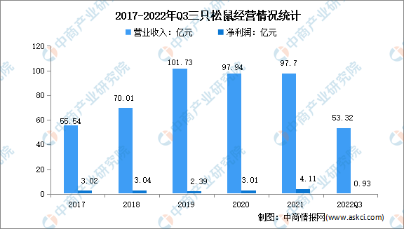 三只松鼠创立于2012年,总部位于安徽芜湖,主营产品覆盖了坚果果干、面包糕点、谷物制品、肉食卤味、方便速食等全品类休闲零食。近年来,三只松鼠推出FD冻干类食品,包括三只松鼠榴莲干、三只松鼠冻干无花果等。2021年,三只松鼠实现营业收入97.7亿元,净利润达4.11亿元。2022年前三季度实现营业收入53.32亿元,净利润0.93亿元。