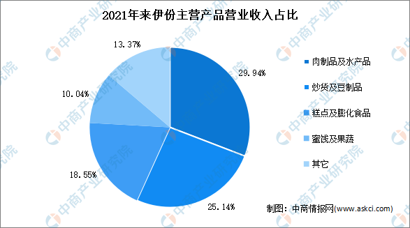 分产品来看,2021年来伊份主营肉制品及水产品、炒货及豆制品、糕点及膨化食品、蜜饯及果蔬,分别占营业收入的29.94%、25.14%、18.55%、10.04%。