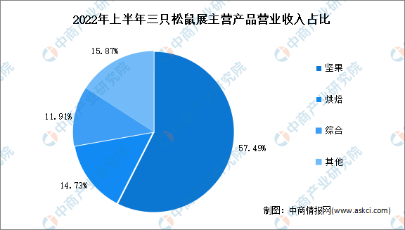 从主营产品来看,2022年上半年三只松鼠主营产品包括坚果、烘焙,营业收入分别为23.65亿元、6.06亿元,占比分别为57.49%、14.73%。