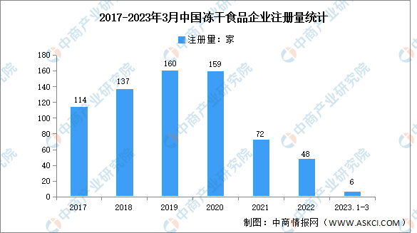 近年来,冻干食品市场兴起,吸引了来自不同领域的生产企业入局。三只松鼠、良品铺子、来伊份等休闲零食品牌推出冻干果蔬零食,小米有品、网易严选等也上线了多款冻干食品,做咖啡的初创公司也推出了冻干即溶咖啡粉。从冻干食品企业注册量来看,我国冻干食品企业注册量呈先增后降趋势,由于疫情影响,2022年注册量降至48家。企查查最新数据显示,截至2023年3月2日,我国冻干食品企业注册量6家。