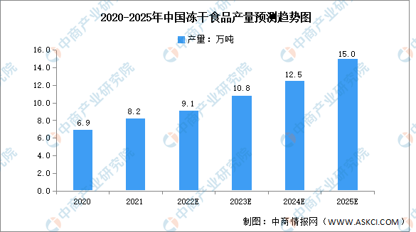 近5年,我国冻干食品产业快速发展,冻干榴莲、草莓等食品吸引了许多消费者,也出现大量多元复合型冻干食品。2020年,我国冻干食品产量达到6.9万吨,预计到2025年,我国冻干食品产量将达到15万吨以上,行业发展空间较大。