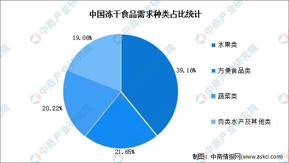 我国的冻干食品分为水果类、蔬菜类、方便食品类以及肉类水产及其他类。从冻干食品需求种类来看,水果类冻干食品是我国冻干食品整体需求最大的品类,占比达到39.16%;其次是方便食品类,需求占比21.65%;蔬菜类、肉类水产及其他类,需求占比分别为20.22%、19.06%。