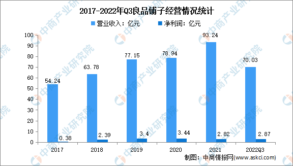 良品铺子主要从事休闲食品的研发、采购、销售和运营业务,产品包括肉类零食、海味零食、素食山珍、话梅果脯等15个品类。2021年,良品铺子营业收入达93.24亿元,净利润实现2.82亿元。2022年前三季度实现营业收入70.03亿元,净利润2.87亿元。