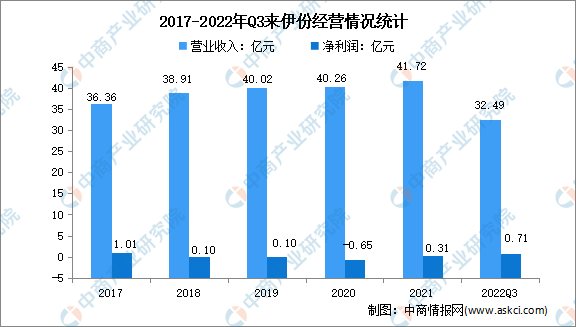 来伊份是一家经营自主品牌的休闲食品全渠道运营商,致力于构建国内领先的专业化休闲食品连锁经营平台。近两年来伊份不断开发与拓展创新品类,推出冻干类食品,满足了不同消费者群体在不同场景下的多元化需求。2021年,来伊份营业收入达41.72亿元,净利润实现0.31亿元。2022年前三季度实现营业收入32.49亿元,净利润0.71亿元。