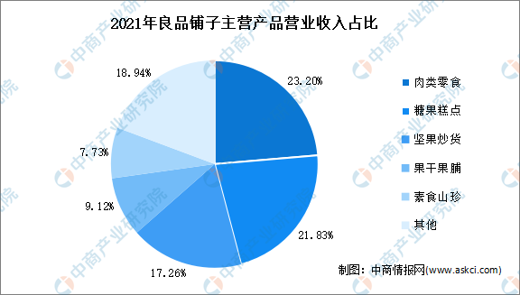 分产品来看,2021年良品铺子主营肉类零食、糖果糕点、坚果炒货、果干果脯、素食山珍,分别占营业收入的23.2%、21.83%、17.26%、9.12%、7.73%。