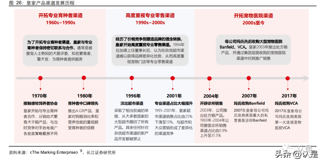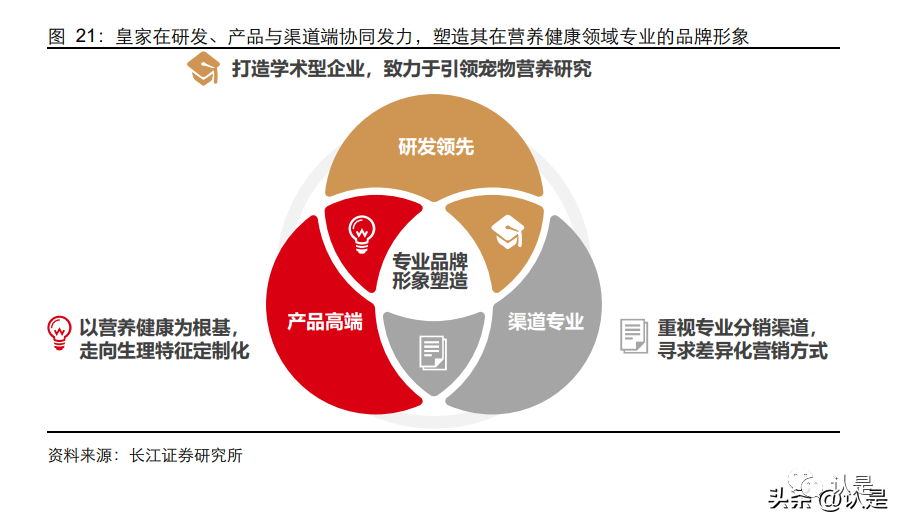 皇家与学术界联系紧密,引领动物营养健康领域研究,产品端依托深厚研发积淀,推出 针对不同生理特征的高端定制宠物主粮,渠道端偏重于能够提供差异化认知的专业分销 门店,从而在消费者心目中塑造其高度专业的品牌形象。在研发端,皇家在向外发展扩 张的过程中同步设立研究中心,持续输出宠物营养研究成果。皇家通过定期在自创期刊 Veterinary Focus 发表研究、举办兽医研讨会不断提升皇家品牌在学术领域的知名度。在产品端,皇家成名即在于其优质营养配方,这也奠定了其营养健康产品路线;在皇家 研发支持下,20 世纪 90 年代其产品通过定制化路线走向高端定位,当前公司主粮产品 根据不同品种的品种特性、不同年龄段、不同尺寸以及处方粮领域的不同症状进行了配 方定制;玛氏入主后,依托集团支持,皇家在 2002 年至今开拓了处方粮与湿粮品类, 并通过持续创新巩固其高端定位。在渠道端,皇家长期高度重视专业分销门店,例如宠 物食品专卖店与宠物医院,专业渠道向消费者提供差异化的产品认知,从而塑造品牌的 专业形象。