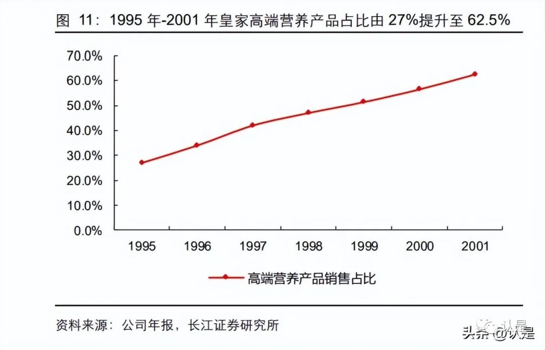 产品高端化:皇家将产品重心聚焦于高端营养品类,基于其深厚的宠物营养研究积淀, 树立了为了不同品种宠物定制化的产品导向。按皇家对当时宠物食品的分类,可以分为 基本产品(大多在超市渠道销售,通常以满足适口性为主要特点,廉价且缺乏差异化)、 优质产品(满足适口性之外,在产品营养上做到均衡,例如蛋白质、碳水、脂肪、维生素等)与高端营养产品(除了适口性与营养性外,针对各种宠物的品种、年龄、健康水 平等特点条件设计的产品),皇家致力于发展高端营养产品品类,1995 年-2001 年皇家 高端营养产品占比由 27%提升至 62.5%。1997 年公司推出了 RCCI SIZE,这是世界上 第一个根据狗的品种、大小与年龄制定的营养计划,1999 年公司为波斯猫推出了世界 上第一个针对特定品种的食品,其杏仁状的颗粒是为了配合波斯猫的颌骨结构,其营养 成分也是旨在满足波斯猫的独特营养需求。而能够推出专业化的产品,也是基于公司的 研发积淀,公司自 1973 年开始即开始针对不对品种的猫狗进行发育期营养研究,1997 年与 1998 年,公司先后推出了狗百科全书与猫百科全书。