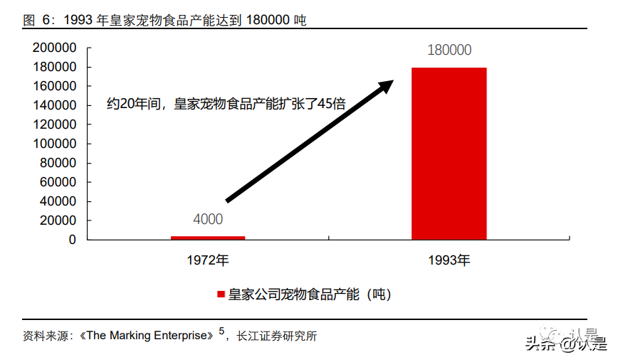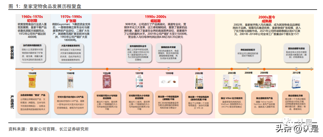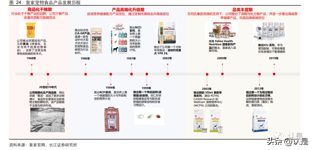 复盘皇家宠物食品产品的变迁历史,在营养健康领域的研发优势持续助力产品更新迭代。其产品成名即在于其优质营养配方,这也奠定了其营养健康产品路线;在皇家研发支持 下,20 世纪 90 年代其产品通过定制化路线走向高端定位;玛氏入主后,依托集团支持, 皇家在 2002 年至今开拓了处方粮与湿粮品类,并通过持续创新巩固其高端定位。皇家 品牌由兽医 Jean Cathary 创立,其成名作“黄汤”即是治愈了法国当地患有皮肤病的 牧羊犬的干粮产品,这也奠定了皇家营养健康的产品定位。皇家高度重视宠物健康营养 领域的研究,树立了在学界的引领地位,这也使得公司能够很好地延续与发展自身产品 的营养健康定位。1980 年公司推出的 A.GR 产品,第一款针对大型犬幼犬设计的宠物 食品,被视为行业标杆,这也开启了公司在生理特征定制化这一产品路线上的尝试。在 经历了由价格竞争到品牌思维的公司理念转折后,皇家在 90 年代坚定地做出了产品高 端化变革,其产品思路即是根据不同的品种、不同的年龄等生理特征推出定制化宠物粮, 这种产品思路建立在皇家对不同生理特征的宠物猫狗生长发育多年深厚研究的基础之 上。2002 年玛氏入主后,公司借助集团优势向更多品类扩张,公司于 2003 年推出了VDiet 兽医专用系列处方粮,这是皇家研发机构与玛氏 Waltham 联合研发的成果,玛氏 于 1994 年投资了美国排名第二的宠物医院集团 Banfield 并于 2007 年控股,2017 年玛 氏全资收购了北美连锁宠物医院 VCA,深厚的宠物医疗渠道优势助力皇家处方粮快速 发展。2009 年皇家推出了 Feline Health Nutrition 湿粮产品,这标志着皇家进入湿粮市 场,此外公司在推出了低敏粮与 ICU 系列等前沿产品,继续巩固品牌高端定位。