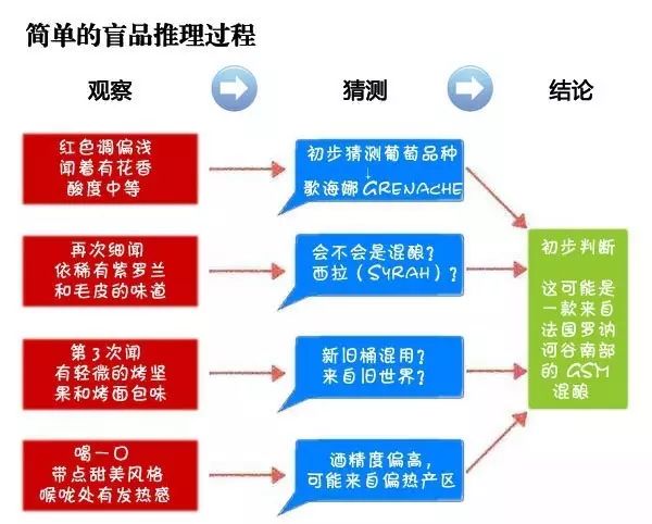 这时候盲品者可以通过眼睛、鼻子、舌头和口腔等各个部位来观察和感受葡萄酒的颜色、挂杯情况、香气、质地、口感和余味等,综合判断杯中葡萄酒的风味特征(酒精度、酸度、单宁和糖分的高低)、品种、酒龄、产区、年份、品质甚至来源酒庄等信息。以下便是一个简单的推理过程☟