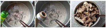 水开后加少量料酒和数滴醋继续煮2分钟,撇去浮沫,将羊排捞出。