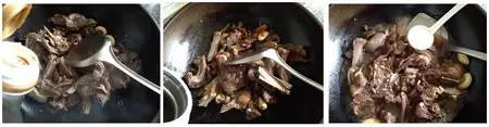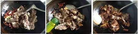 下羊排炒干水汽,烹料酒略炒,加生抽、老抽炒至上色。
