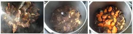 加开水至没过羊排,加盐调味,移入高压锅,加调料盒(里面有花椒和山楂),大火上汽后转小火约30分钟,加入胡萝卜煮至软烂,下泡好的粉条煮熟即可。