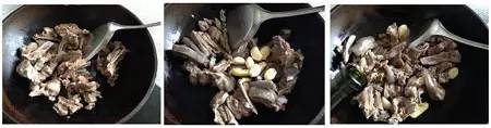 热锅冷油,放入羊排翻炒,炒干水汽后加入生姜、大蒜和黑胡椒继续翻炒出香味,加入约150毫升红酒,继续翻炒约2分钟。