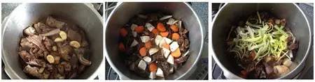 移入高压锅中,大火煮开上汽后转小火压15分钟关火,自然排气后放入胡萝卜和芋头块,继续压约5分钟,打开加入芹菜段,煮至芹菜稍变软即可。
