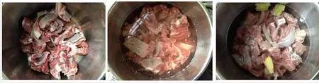 羊排加姜片,凉水入锅焯水,煮至水开后,加少许料酒,撇去浮沫,继续煮约2分钟,捞出备用。