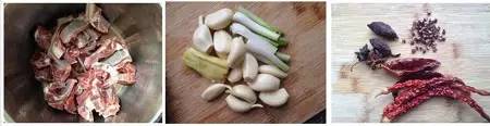 羊排洗净,葱切段,姜拍散,大蒜整粒,干辣椒煎段。还有一味山楂忘了拍上。