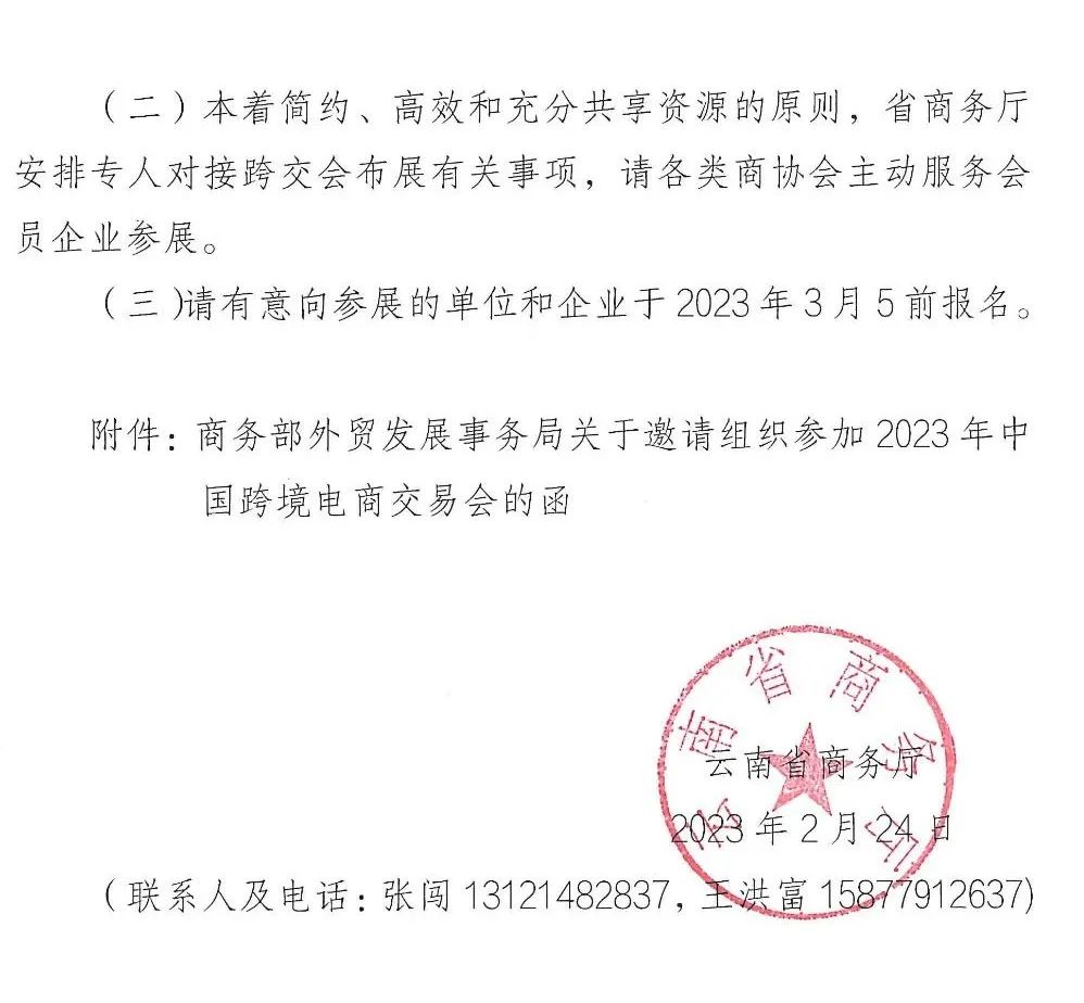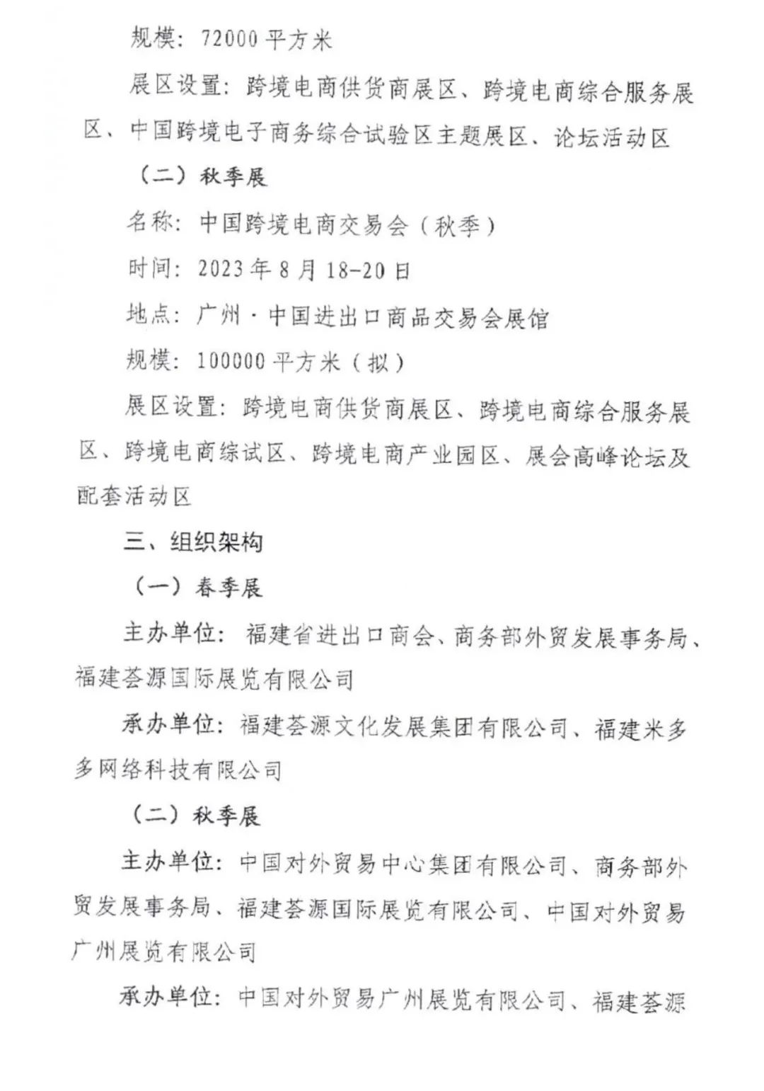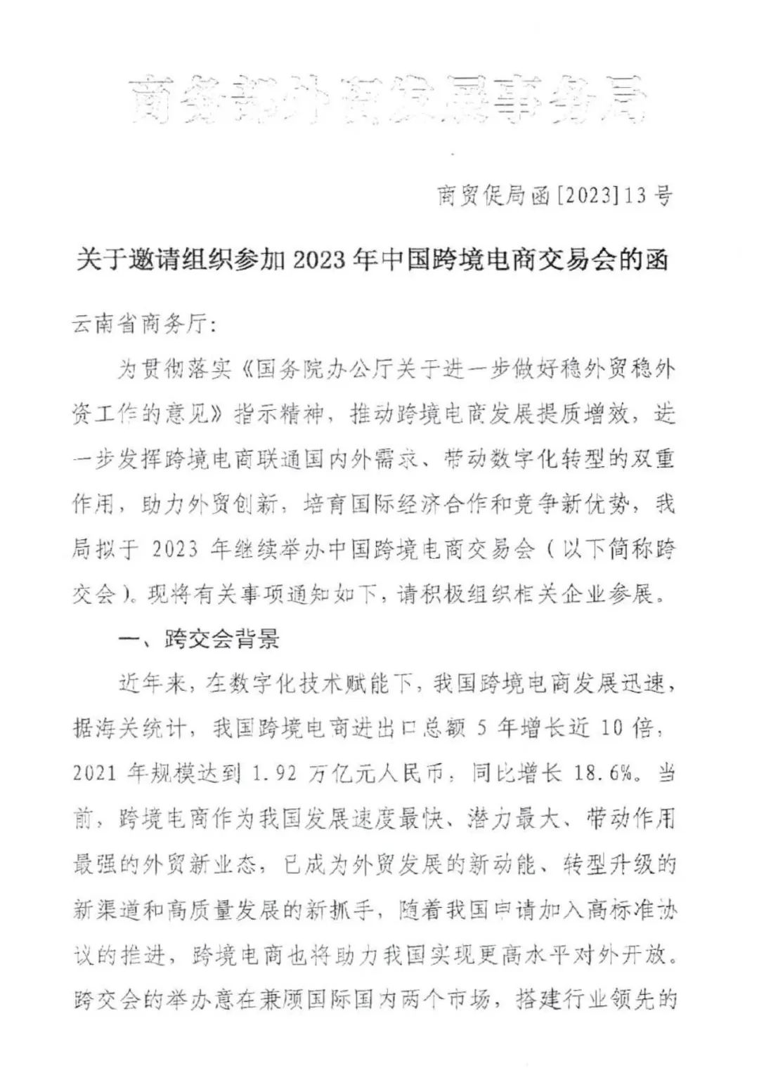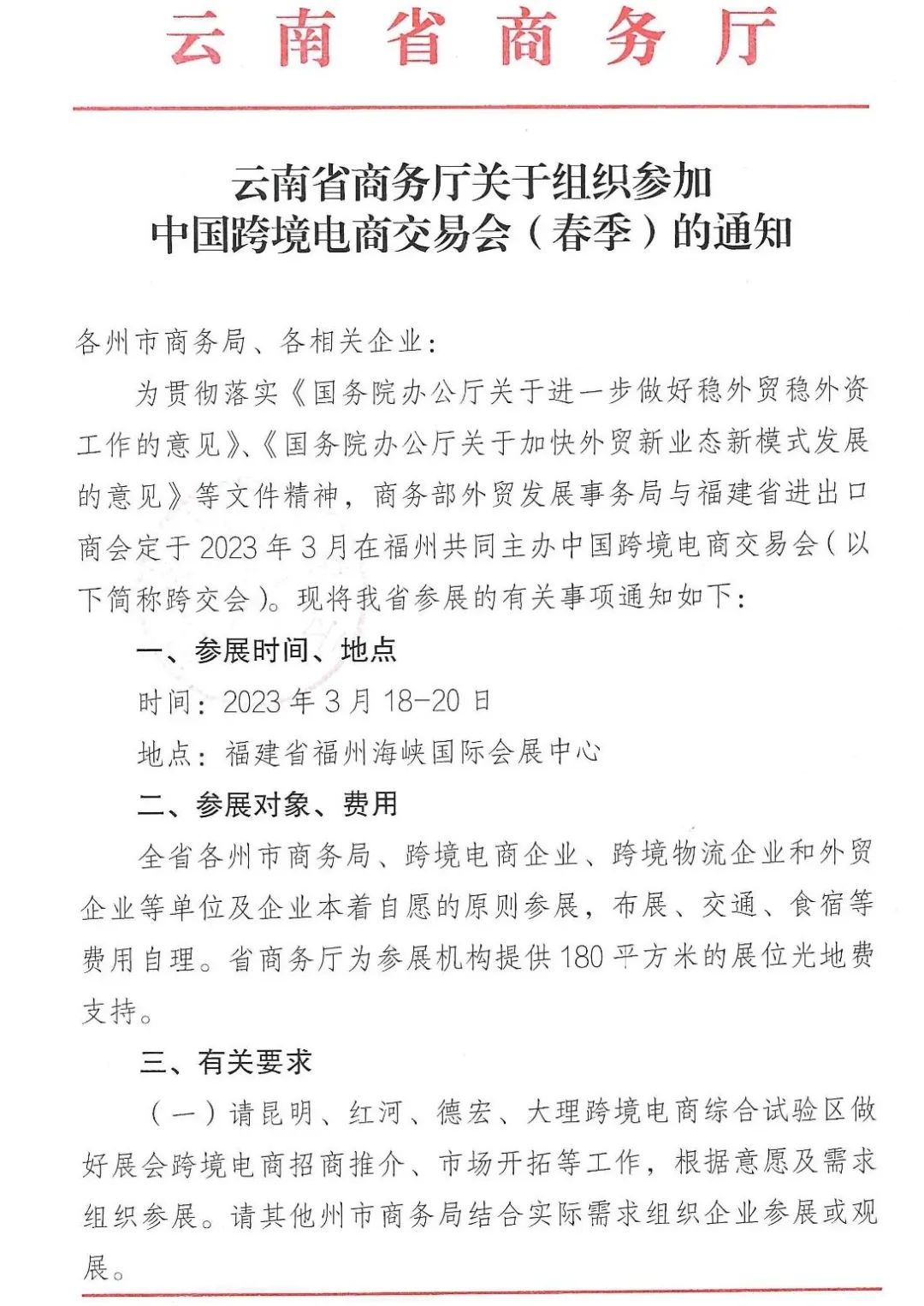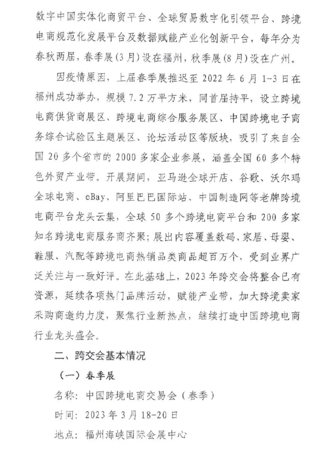 商务部外贸发展事务局与福建省进出口商会定于2023年3月18—20日在福州共同主办中国跨境电商交易会,请有意向参展的单位和企业于2023年3月5日前反馈报名表。