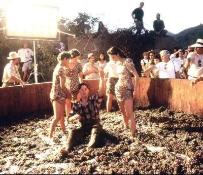 在葡萄庄园庆祝丰收的时候,人们将收割下的葡萄丢入巨大的木盆里,青年男女跳进去随着欢快的音乐跳动起来。每个人脸上都洋溢着丰收喜悦的笑容,男主在这一刻被女主的笑容所感染,爱上她了。镜头下,阳光下飞溅而起的葡萄汁液,带着人们的诚心和美好。
