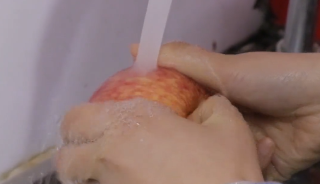 然后把苹果放里面清洗。其实葡萄酒和小苏打一样,都是水果的清洗剂,葡萄酒中的酒精也可以溶解果蔬表面的杂质,而且葡萄酒中的各种成分都可以杀死食物中的各种病原体,比如大肠杆菌等。