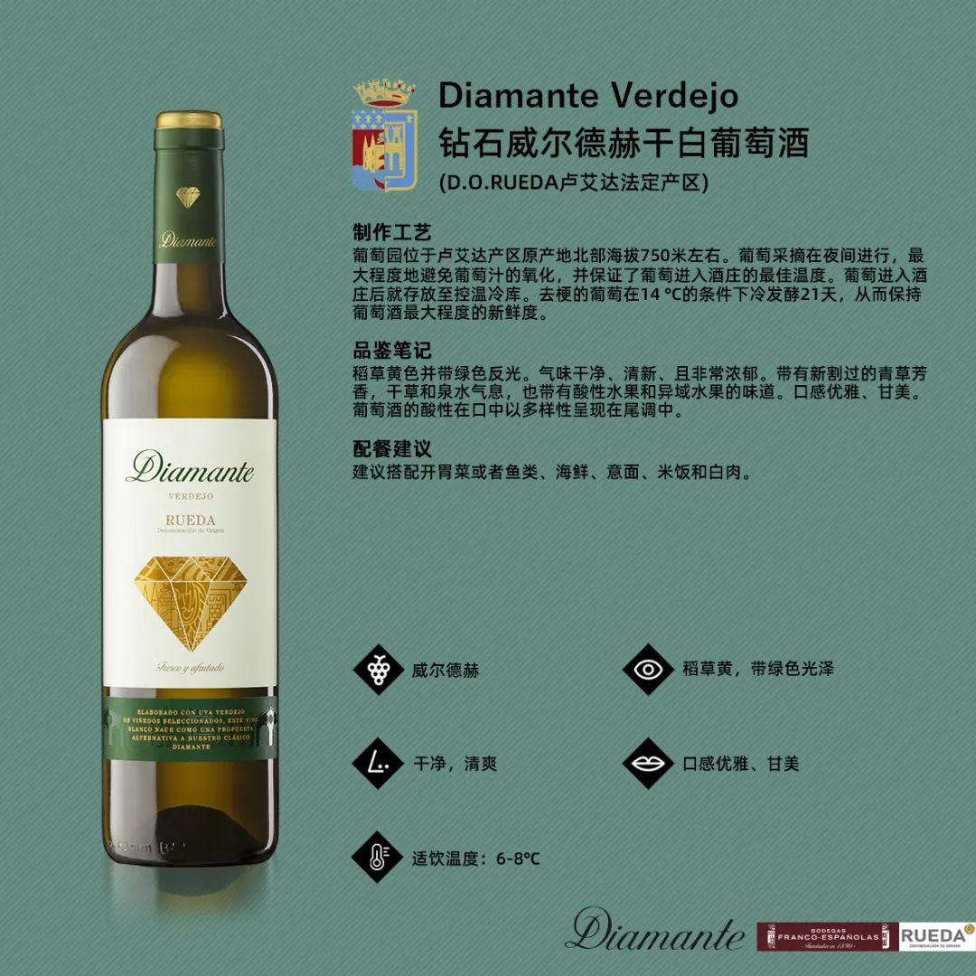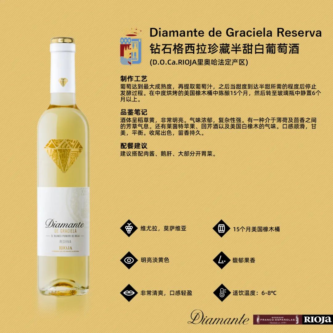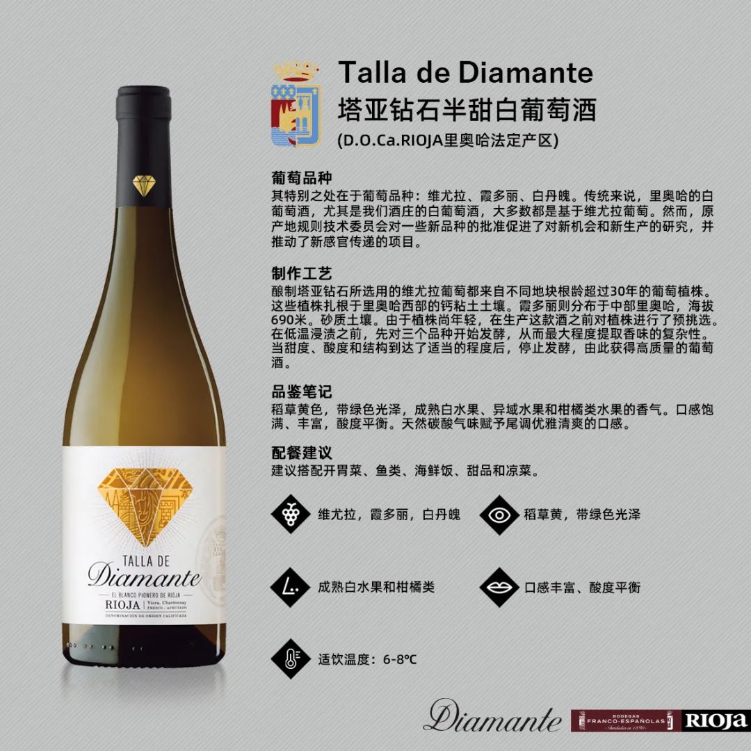 钻石半甜白以其柔滑和奶油味而著称,带有成熟水果的香气和带有金黄色调的黄色,使其成为开胃菜、贝类、鱼类、米饭、凉菜和甜点的理想伴侣。