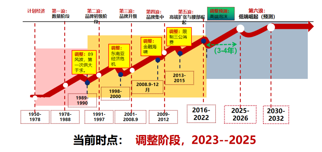近几年,全球宏观背景发生三大改变,在此背景下,白酒周期趋势会走向何方?站在世界的高度看中国、从国家宏观经济看行业未来、从行业整体看企业发展,当下白酒乃至整个中国经济都逃不出长周期、中周期、短周期的综合作用,当然受国家政策等反周期措施影响,中国经济周期与世界经济周期存在错峰现象,就中国白酒而言,目前正处于第三波发展期的第五次与第六次浪潮过渡的调整阶段。结合三大周期规律和30年的行业行走经验,我制作了这张白酒行业发展脉络图。不难看出,白酒历经几次大调整,虽然驱动因素不尽相同,周期也有长有短,但总体上基本与三大周期的交互影响,并呈现出与整体经济形势同步的繁荣与收缩,整体趋势向上。我认为,从2012年到2023年中国白酒的主要特征是以高端扩张带动腰部崛起,腰部崛起再带动中下价位的阶梯式升级。2013年到2015年产业调整阶段,行业增长明显由大众酒带动,而2017年-2019年期间高端酒强势回暖,但到2020年之后,高端白酒快速拉升,产业泡沫逐步堆积,特别是酱香白酒鸡犬升天,加重与加速了产业泡沫汇聚,产业调整也由此展开。随着超高端与高端的逐步调整到位,行业将在2023年-2030年进入到“低端崛起”为特征的第六浪潮期。另一方面,与国外蒸馏酒相比较,世界十大高端蒸馏酒中,中国已经占有6席,拥有世界第一大酒种、第一大消费市场、第一大高端白酒市场。中国白酒市场未来发展的基础逻辑,也将彻底改变。但也有的人表示担心,90后、00后不会喝酒,或者说喝酒频次分量大幅减少。我想表达的是,这种担心是多余的。很简单,随着80后成为政府、企业等社会中层领导力量,90后成为骨干,00后刚刚步入职场,社会发展决定“长江前浪推后浪”,实现新文化与新场景的对接,促成了消费换代与文化升级。唯一有所不同的是,90后的出现,对未来白酒品牌文化提出了新的要求,休闲型的消费场所、公务性的消费场景、礼品性的消费需求共同构成了白酒销售新的底层逻辑。除了白酒周期、消费迭代核心因素外,构成白酒持续向好的四梁八柱还包括三香七方、四香五层的竞争格局。打开中国地图,四川和贵州构成的世界上最大的蒸馏区版块,是中国酒业的核心组成部分。除川黔外,江苏宿迁、安徽亳州和淮北、湖北、山西汾阳、北京共同组成浓香、清香、酱香的三香七方格局。需要注意的是,未来10年华北、东北、西北地区可能要回到清香怀抱。其中,酱香和浓香占据大半壁江山,清香、兼香、米香其次。酱香在超高端占有绝对优势,浓香在高端、次高端保持领先,清香在低端快速发展。