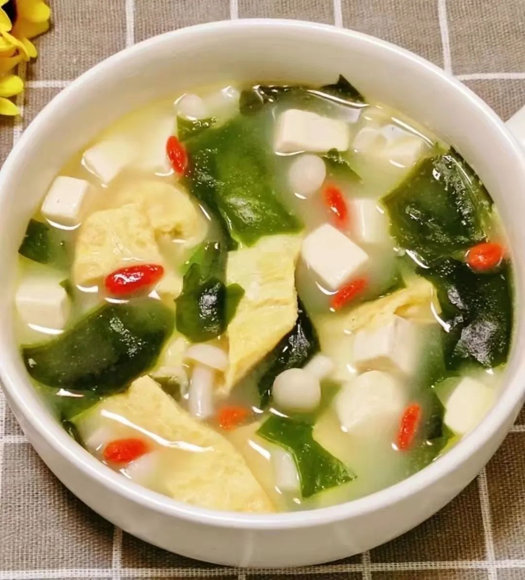 裙带菜开口汤(三鲜豆皮5克、裙带菜5克、金针菇5克)