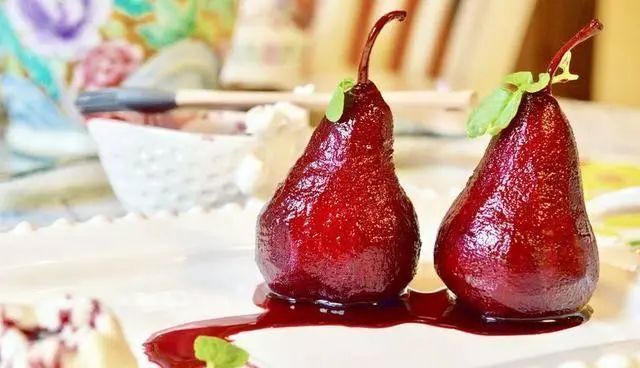 其他配料还有冰糖,蜂蜜,柠檬,肉桂(选用),丁香(选用);2、梨和柠檬都加入一口小锅中,倒入红酒至淹没梨即可,不要加水,视个人口味加入适量冰糖或蜂蜜,以及肉桂,丁香,可以提供更复杂的口感;3、开小火加热,保持微沸状态,梨在红酒的作用下会逐渐变红,同时小心翻动梨,使得各个部位都充分加热入味,同时用勺子不断把汤汁浇在梨上面;4、待梨的色泽与红酒基本一致之后,捞出摆盘,将锅内剩余的汤汁加热至浓稠,浇在上面即可大功告成;5、趁热食用相当美味,也可放于冰箱冷藏静置十二小时,待红酒深入梨内再来享用;在这个春雷乍动、雨水增多,万物生机盎然的日子里,来一份红酒炖梨,那简直不要太幸福~
