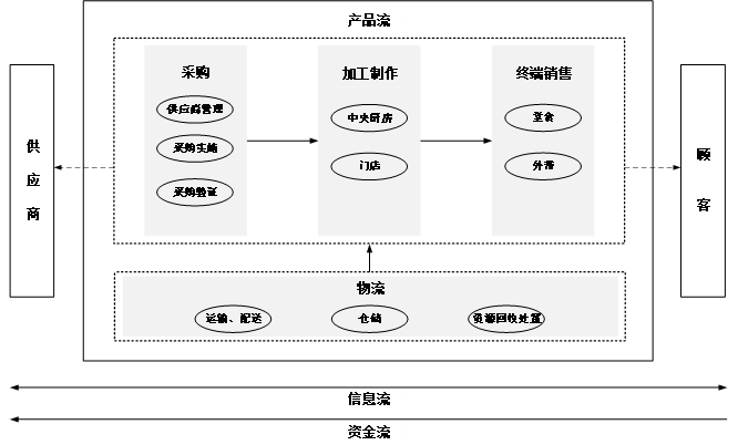 结合供应链管理相关行业标准,通过与中西式不同业态餐饮企业进行沟通,将餐饮业供应链的模型“产品流”要素抽象概括为采购、加工制作、终端销售、物流四大关键要素,其中“采购、加工制作、终端销售”为餐饮业价值实现主过程,“物流”在内涵上包括“运输配送、仓储、资源回收处置”服务贯穿于价值实现主过程,属于支持性要素。该过程向上对接供应商,向下对接顾客需求等。产品流的流向是由供应商到顾客,资金流的流向相反,而信息流则是双向流动,基本理念与经典供应链管理理论一致。