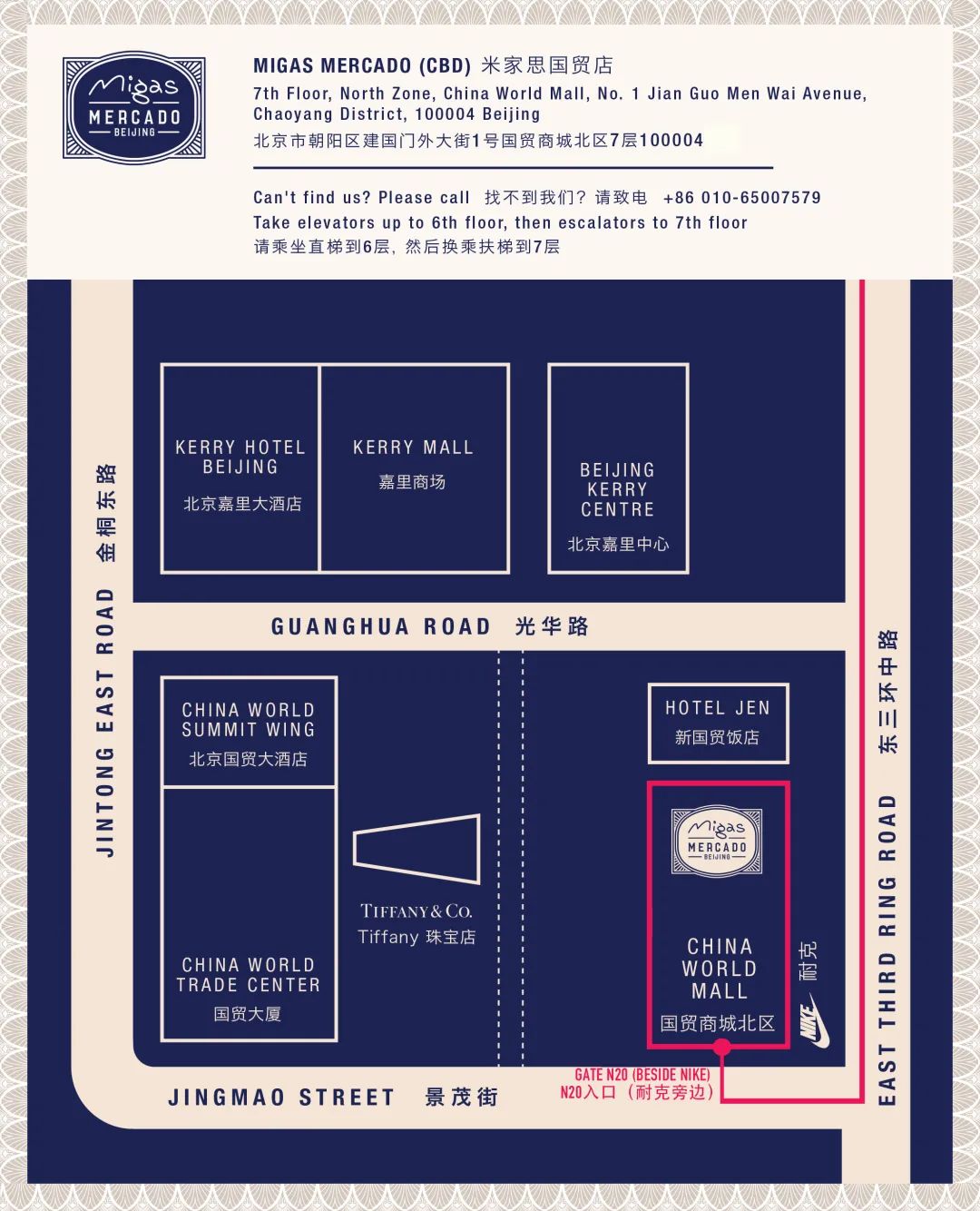 Migas Mercado7th Floor, North Zone, China World Mall, No.1 Jian Guo Men Wai Avenue, Chaoyang District, 100004 Beijing北京市朝阳区建国门外大街1号国贸商城北区7层100004Tel:010-65007579