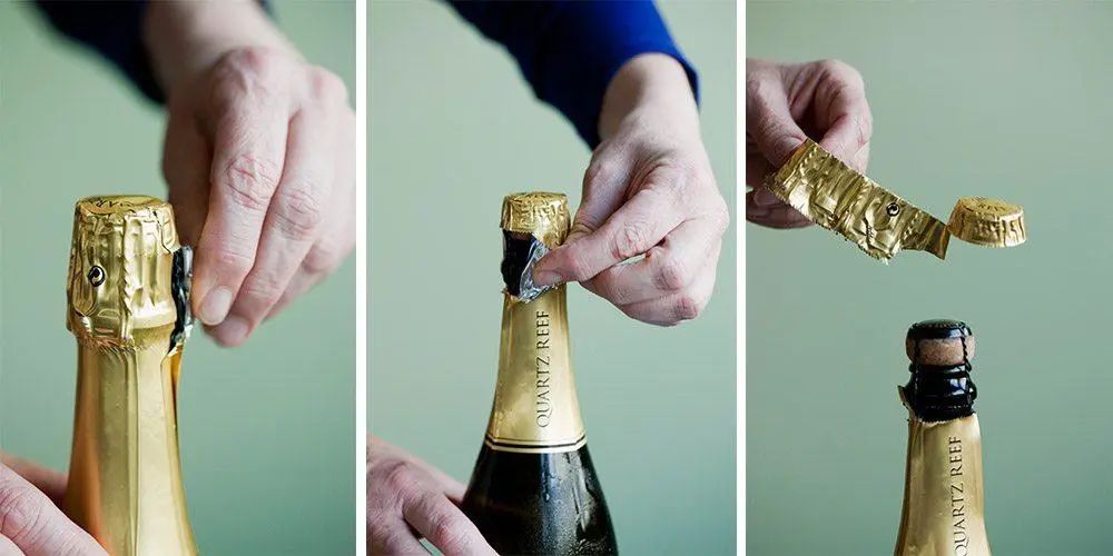 逆时针解开笼子,过程中持续对软木塞施力,防止它太早弹出来。