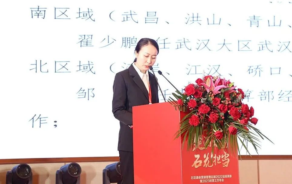 公司企业管理总部副部长、营销管理总部综合管理部部长杜斌宣读《石花酒业营销管理总部“10050 俱乐部”管理办法》及《关于表彰2022年度石花酒业营销管理总部“10050俱乐部”成员的决定》。在会上分别对“100俱乐部”成员和“50俱乐部”成员进行了表彰奖励。