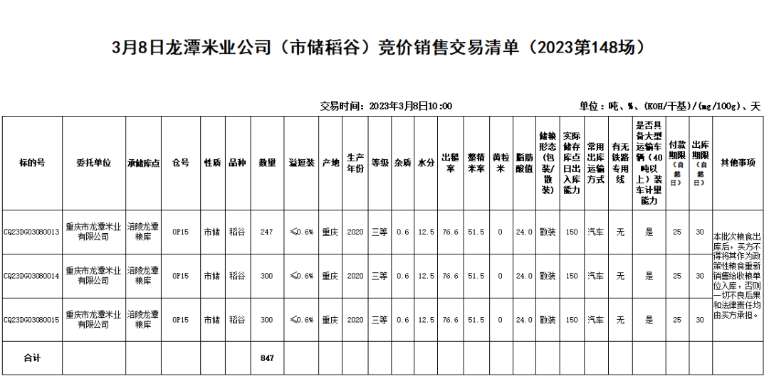 受重庆市龙潭米业有限公司委托,重庆市粮油批发市场有限责任公司(即国家粮食重庆交易中心,以下简称“批发市场”)定于2023年3月8日10:00举办龙潭米业公司(市储稻谷)竞价销售交易会,现将有关事项公告如下:1. 标的号:CQ23DG03080013—CQ23DG03080015。2. 产地、年限及数量:重庆2020年产稻谷847吨。4. 标的质量:以交易清单质量指标为准。有意向参与交易的会员可通过“重庆粮网”(www.grainmarket.com.cn/centerweb/region/CQ)、“重庆粮食集团”官网(www.cqgrain.com)→资料下载→《竞价销售粮油看样单》路径,填写后加盖公章邮寄或扫描至批发市场,经批发市场审核盖章后,提前实地查看粮食实物质量和路况、出库条件等情况,确保所竞买的粮油符合自身使用用途,自主确定是否购买,并承担竞买后相应责任和市场风险。如未提前看样或看样后参与交易的,均视同认可标的质量,成交后不得再对质量提出异议。5. 本次交易清单附后。具体交易品种和数量等信息如有变化,以即时公告及交易清单为准。1. 报名资格:国内具有粮油生产、经营资格的企业或个人且在国家粮食交易平台注册的有效会员。2. 报名时间:2023年3月8日8:00前。报名参与交易即视作全面承认并遵守《重庆市地方政府储备竞价销售交易规则》和交易公告、交易清单等要求。1. 本次竞价交易使用国家粮食交易平台地储交易系统,2023年3月8日10:00通过网络对委托标的依次按交易节进行交易。请报名参加竞价交易的会员按时登录国家粮食交易中心官网(www.grainmarket.com.cn)→点击网页上方“请登录”或右方“用户中心”进行会员登录→点击“交易”板块→选择“重庆市场”→“ 3月8日重庆市地方储备粮(龙潭稻谷)竞价销售交易专场”。1. 保证金的收取和释放:参与竞价交易的买卖双方各须交纳保证金110元/吨(其中:履约保证金100元/吨和交易保证金10元/吨)。买方保证金须在竞价销售交易会开始前2个小时汇至批发市场指定银行账户;卖方保证金须在提交委托交易清单当日汇至批发市场指定银行账户。单笔合同交割完毕后,保证金释放。如合同部分交割,该合同数量的所有保证金处于冻结状态。2. 保证金转入:汇款时请备注“保证金”,待资金到账后,进入系统“用户中心”的资金界面,点击用户名称下方的“交易账户:明细”,将足额保证金“转入”重庆市场。3. 交易手续费:按成交金额的1.5‰向买方收取。1. 成交价格:为交易系统确认价格,即卖方承储库仓(罐)前散装车板交货价格,不含包装及整理费用,无出库费,无水、杂增扣量。如买方有包装以及整理要求,可与卖方协商,费用按照协商一致的标准另行结算。2. 合同签订:自成交之日起3个工作日内买卖双方在交易系统内签订电子购销合同或以邮寄、扫描等方式签订,如逾期未签订购销合同,则对违约方作违约处理。3. 付款及出库:买方自成交之日25天内付款完毕,30天内出库完毕。买方成交后将货款一次或分批汇入批发市场指定银行账户。出库前,买方在“我的合同”中点击“支付货款”来完成出库通知单申请。批发市场收到申请后,及时审核并开具《出库通知单》。4. 结算:出库完毕后买卖双方签订《验收确认单》,由卖方送达批发市场,批发市场在2个工作日内按《验收确认单》办理货款结算。2. 开户银行:中国农业银行股份有限公司重庆九龙坡中梁山支行 3. 账 号:31-0707010400088881. 本次交易规则详见“重庆粮网”(www.grainmarket.com.cn/centerweb/region/CQ)、“重庆粮食集团”官网(www.cqgrain.com)《重庆市地方政府储备竞价销售交易规则》,与此规则不一致的以本次公告为准。2. 会员在交易前到委托方存储库点看样或成交后到委托方存储库点提货时,需遵守当地的疫情防控政策,做好疫情防控工作。3. 本批次粮食出库后,买方不得将其作为政策性粮食重新销售给收粮单位入库,否则一切不良后果和法律责任均由买方承担。4. 各会员单位发现以陈顶新、转圈粮、套取财政补贴、人为设置障碍造成出库难、不执行出库质量检验制度等违法违规问题的,请拨打12325举报。5. 市场交易部联系电话:023-65269777 023-65269283