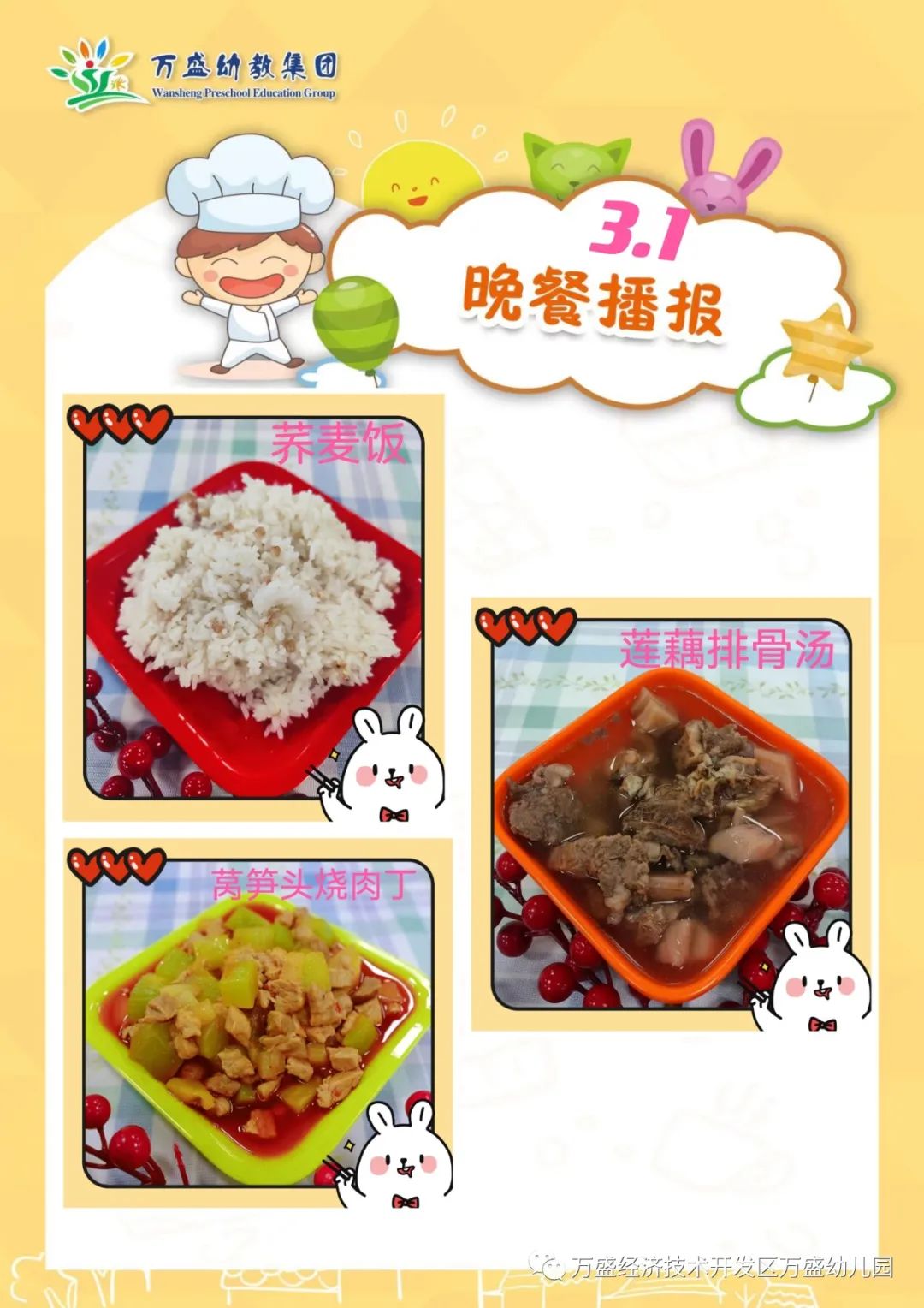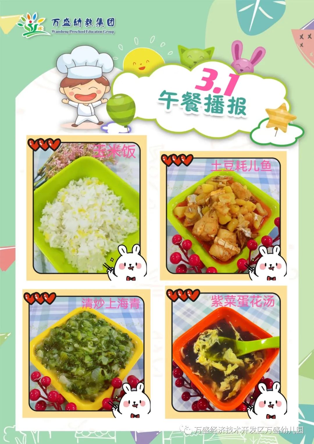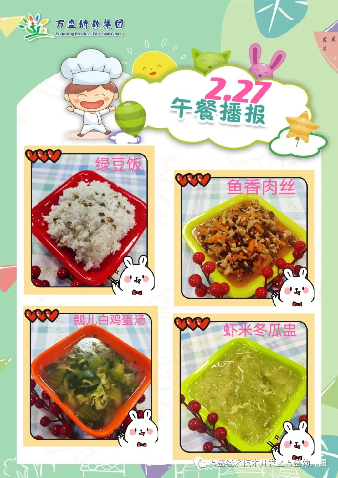 午餐:绿豆饭、香菇烧排骨、番茄炒鸡蛋、青菜丸子汤