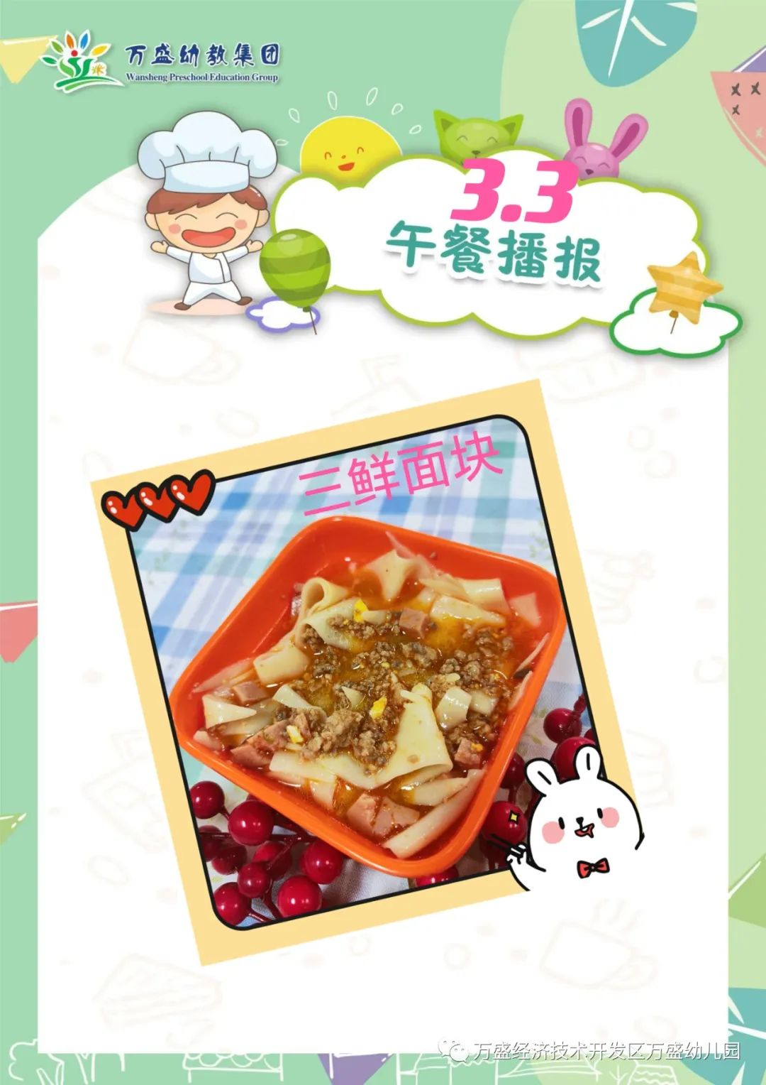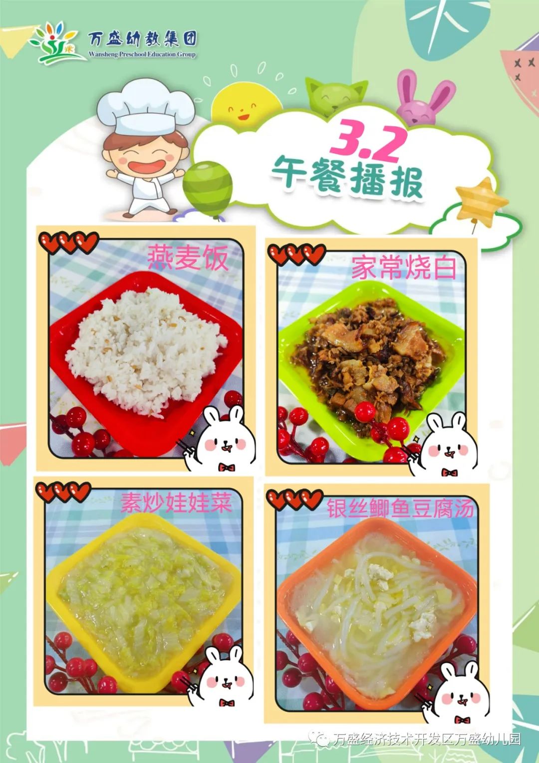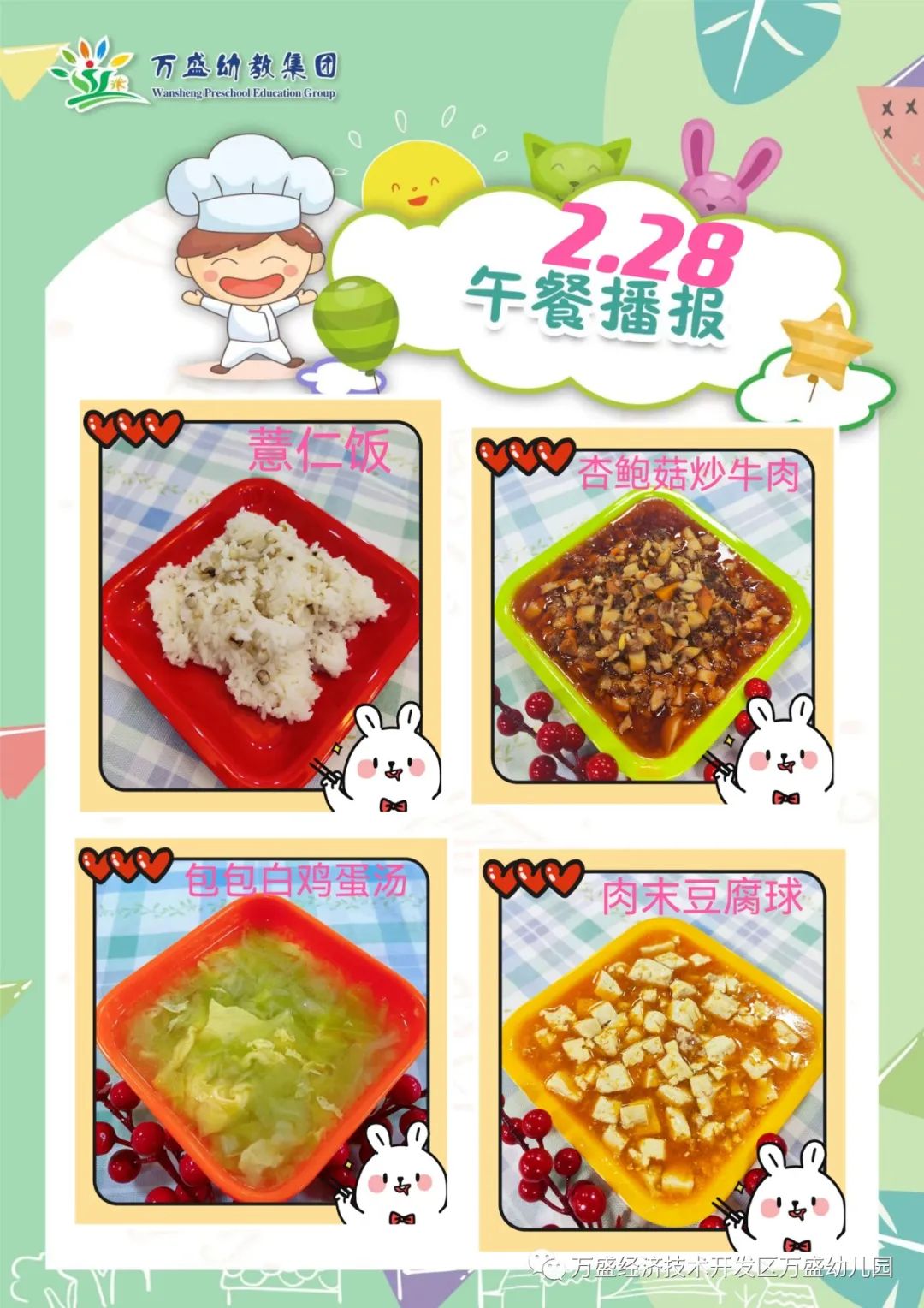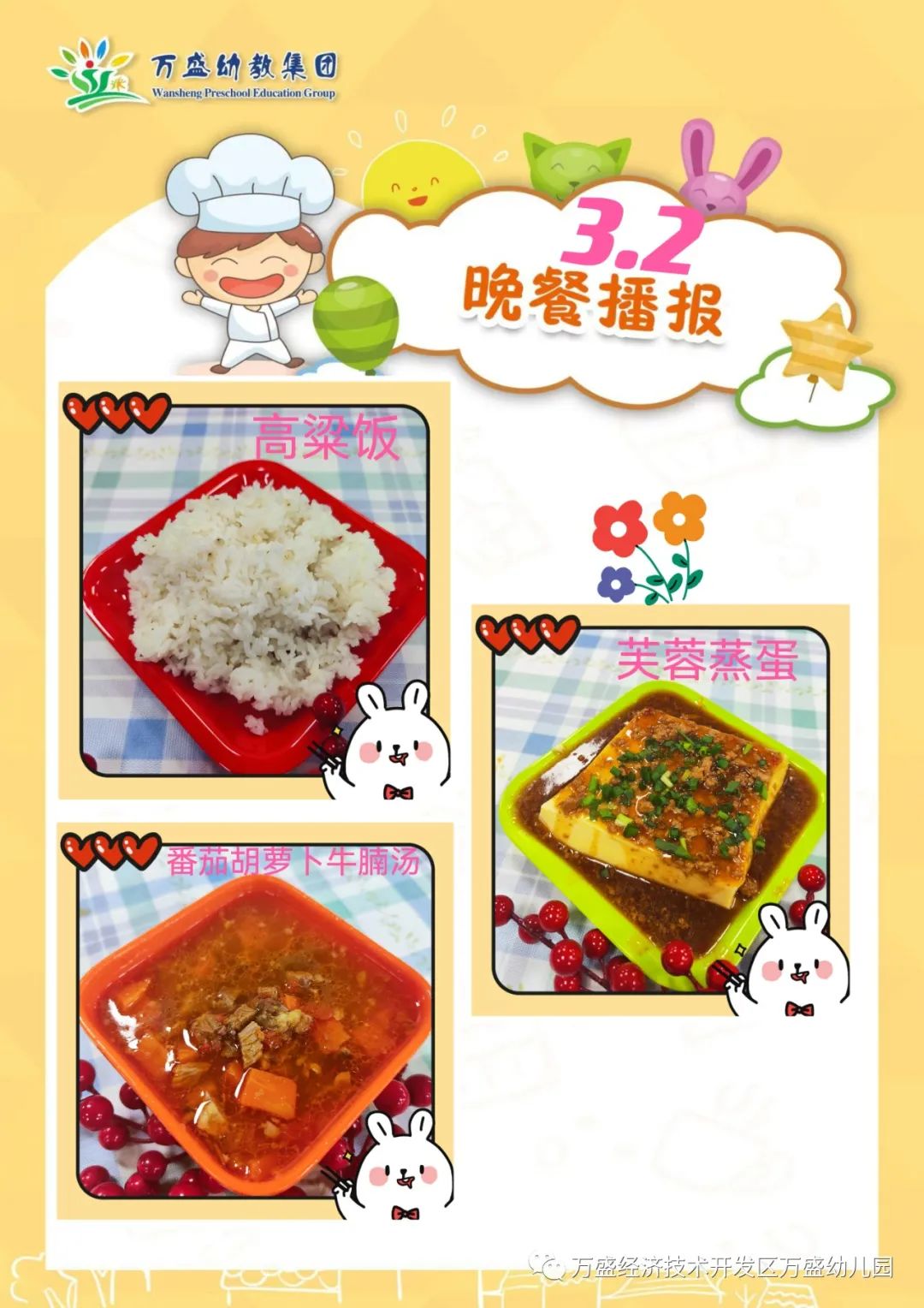 午餐:高粱饭、滑蛋牛肉、素炒白菜、番茄肉泥汤