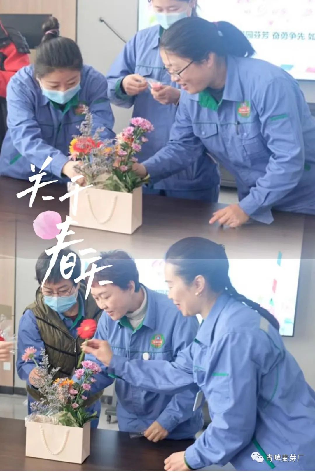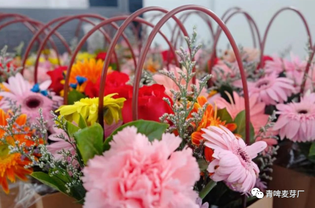 利用巧思,收获芬芳。麦芽厂工会用花激发女职工们的浪漫因子,发挥心灵手巧的特质,组织女职工们开展DIY插花活动。在礼物包装的选择上,牢记绿色、低碳的青啤环保理念,选择了坚固、可重复利用的帆布材质。用小小的巧思让理念融合节日,让祝福更具意义。