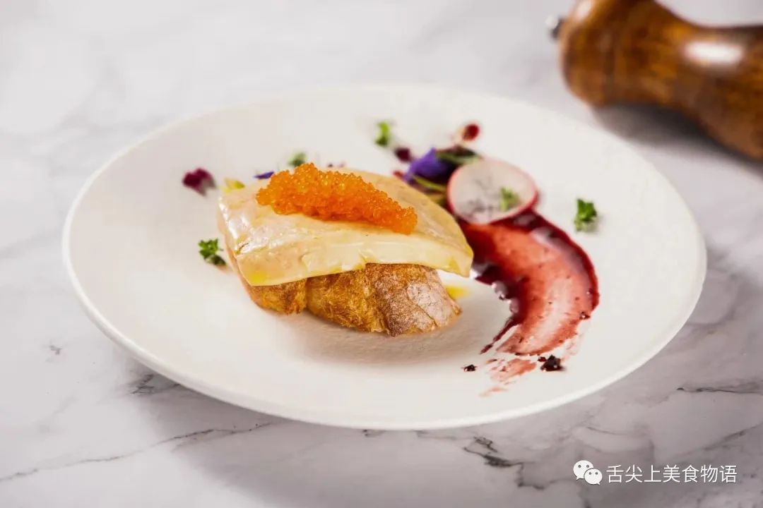 法棍垫底后放上鹅肝,在旁边淋上熬制好的红酒蓝莓酱即可食用。