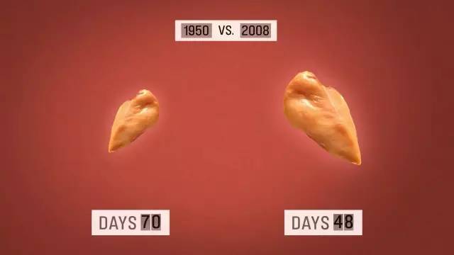 食品公司通过选育和基因工程,对鸡的构造进行了调整,鸡胸肉也变成了过去的几倍大。