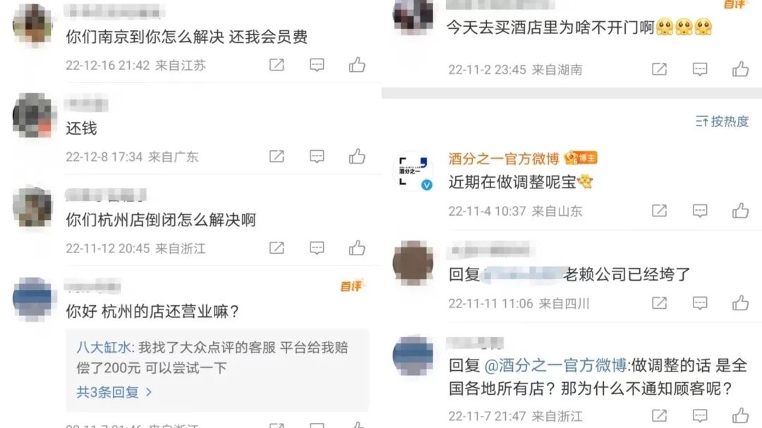 酒分之一官方微博最后一条内容发布于2022年11月3日,其评论下IP地址在江苏南京、浙江杭州及湖南长沙等城市的网友都透露出“酒分之一失眠便利店”关门、倒闭的信息,消费者也在评论区讨要会员费。