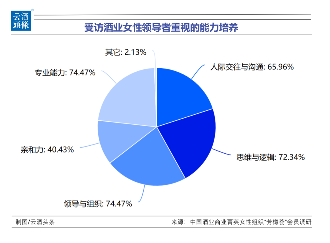 她们在酒业的扎根,也为后来者开辟出了一条方向更加明确的路。在酒业女性能力培养方面,专业能力、领导与组织能力、思维逻辑能力、人际交往与沟通能力、亲和力等都成为关注重点。其中专业能力最受到重视,超过76%的成员选择了这一项,其次便是领导与组织能力。