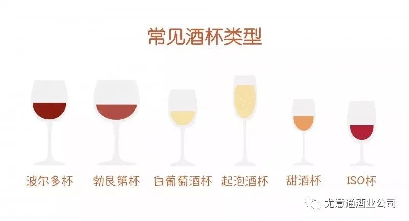 杯腹的直径、杯身的长度、杯口的宽度甚至杯壁的厚度,都会对葡萄酒的风味产生微妙的影响。同一款酒,使用形状各异的杯子品尝,会产生不同的口感。常见的酒杯有如下几种:(从左至右的顾序) 波尔多红酒杯、勃艮第红酒杯、白葡萄酒杯