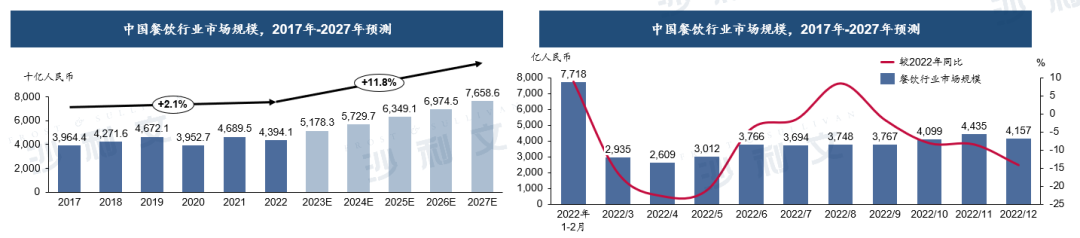 长期来看,随着人均可支配收入及消费增加、外出就餐需求增加、消费理念转变等多重因素影响,我国的餐饮行业中长期依然会有稳健发展。预计到2027年,我国餐饮行业市场规模将达到7.66万亿人民币,2022-2027年期间,年复合平均增速达11.8%。