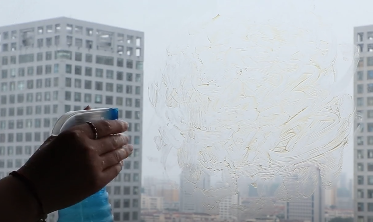 第一步,清洗玻璃,我们可以看见有许多污渍,油渍,灰尘等,此时,我们可以在玻璃上喷洒这种液体,然后放置3分钟。