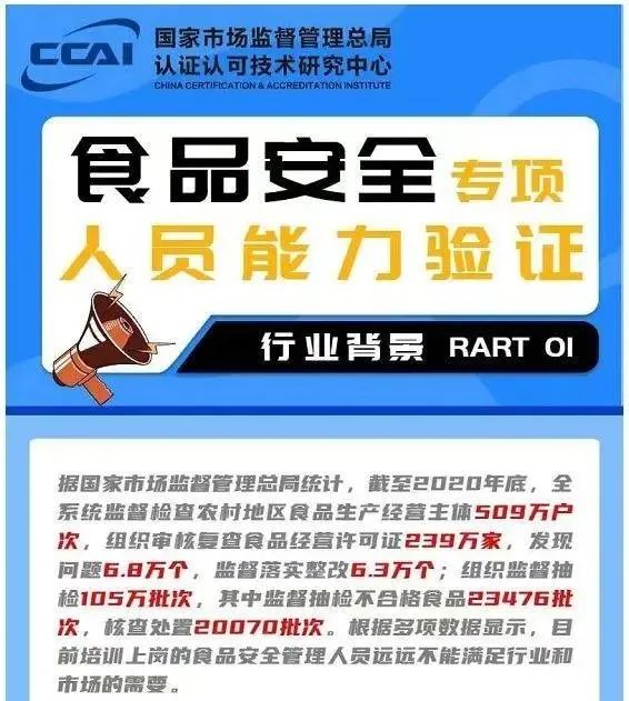 为扎实建立食品安全领域人才培养机制,促进食品行业健康发展,国家市场监督管理总局认证认可技术研究中心(以下简称“市场监管总局认研中心”)依据自身职能属性,在相关政策引导下开展了包含食品安全员、食品安全管理师和食品安全总监在内的专项人员培养培训及能力验证工作。