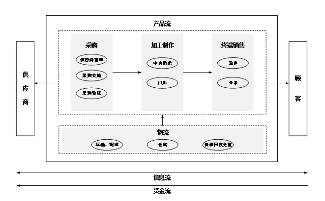 结合供应链管理相关行业标准,通过与中西式不同业态餐饮企业进行沟通,将餐饮业供应链的模型“产品流”要素抽象概括为采购、加工制作、终端销售、物流四大关键要素,其中“采购、加工制作、终端销售”为餐饮业价值实现主过程,“物流”在内涵上包括“运输配送、仓储、资源回收处置”服务贯穿于价值实现主过程,属于支持性要素。该过程向上对接供应商,向下对接顾客需求等。产品流的流向是由供应商到顾客,资金流的流向相反,而信息流则是双向流动,基本理念与经典供应链管理理论一致。