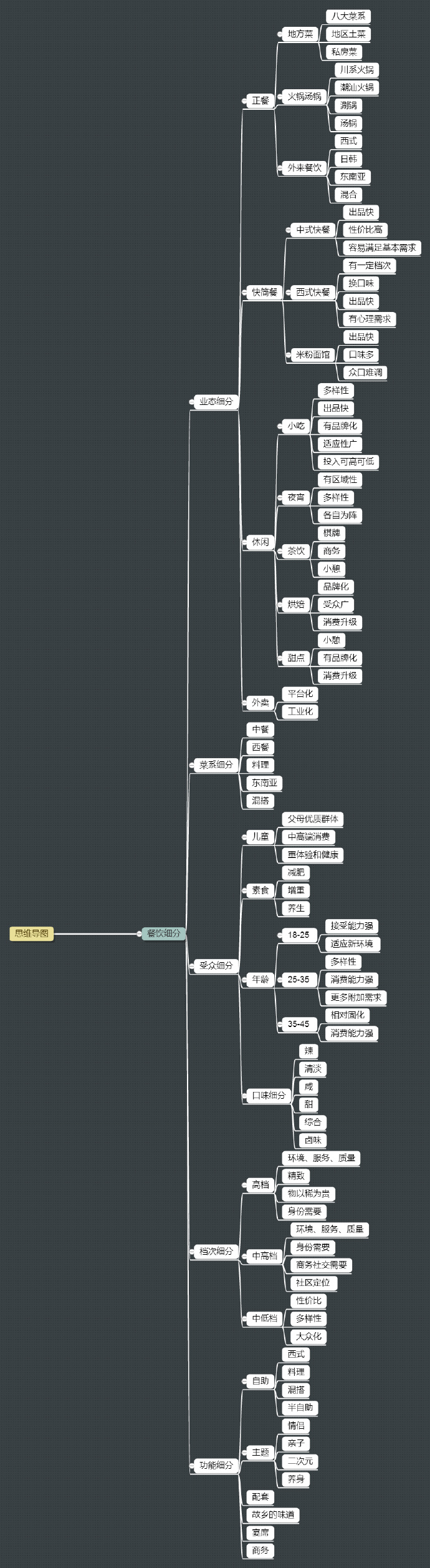 通常一家餐厅将兼具几个纬度的特点,例如海底捞就是一家正餐-火锅、定位中档的中餐厅,详细内容可见下方脑图。你喜欢的餐厅是那一类呢?